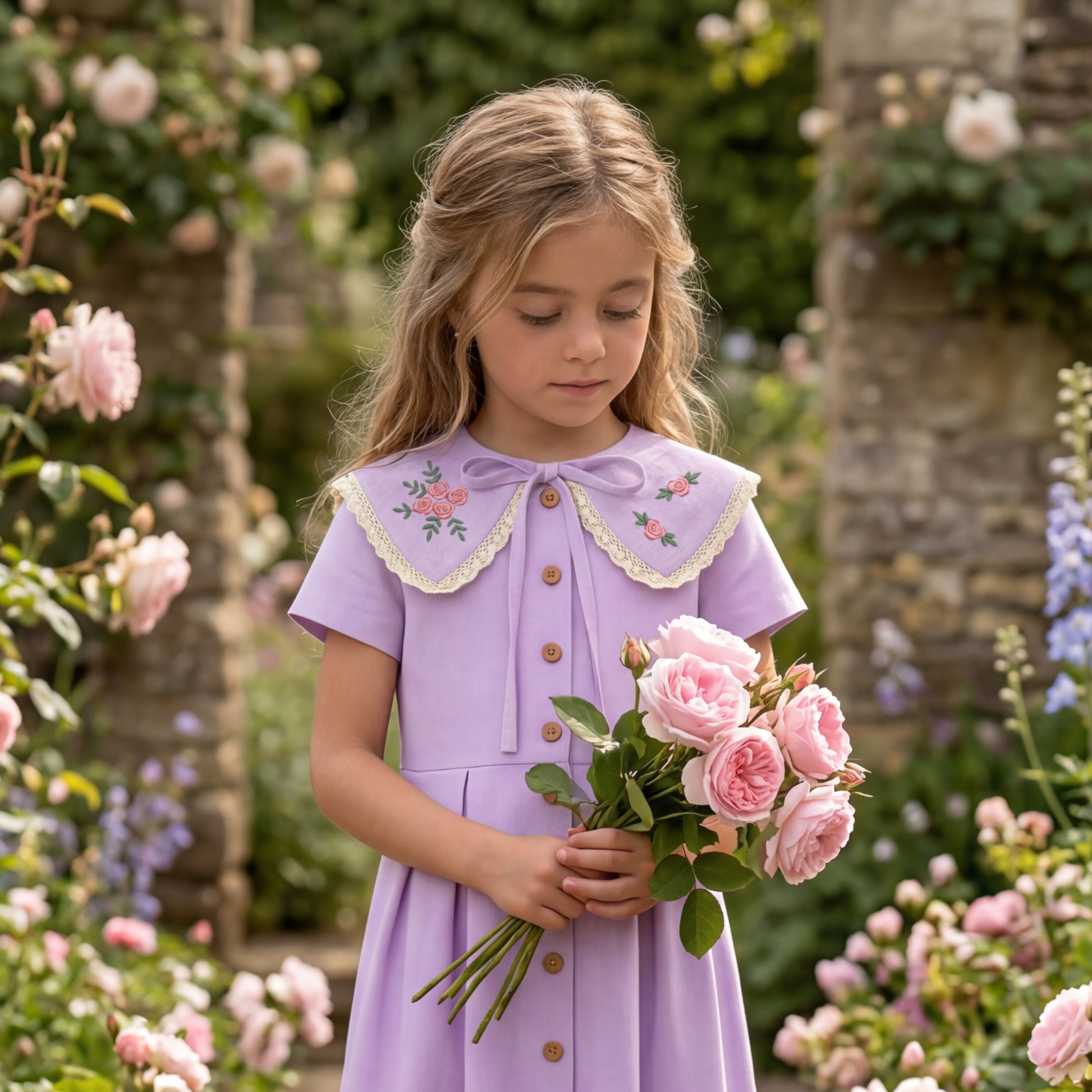 Un colletto delicato e raffinato, realizzato in lino naturale e impreziosito da ricami floreali ispirati ai giardini romantici.