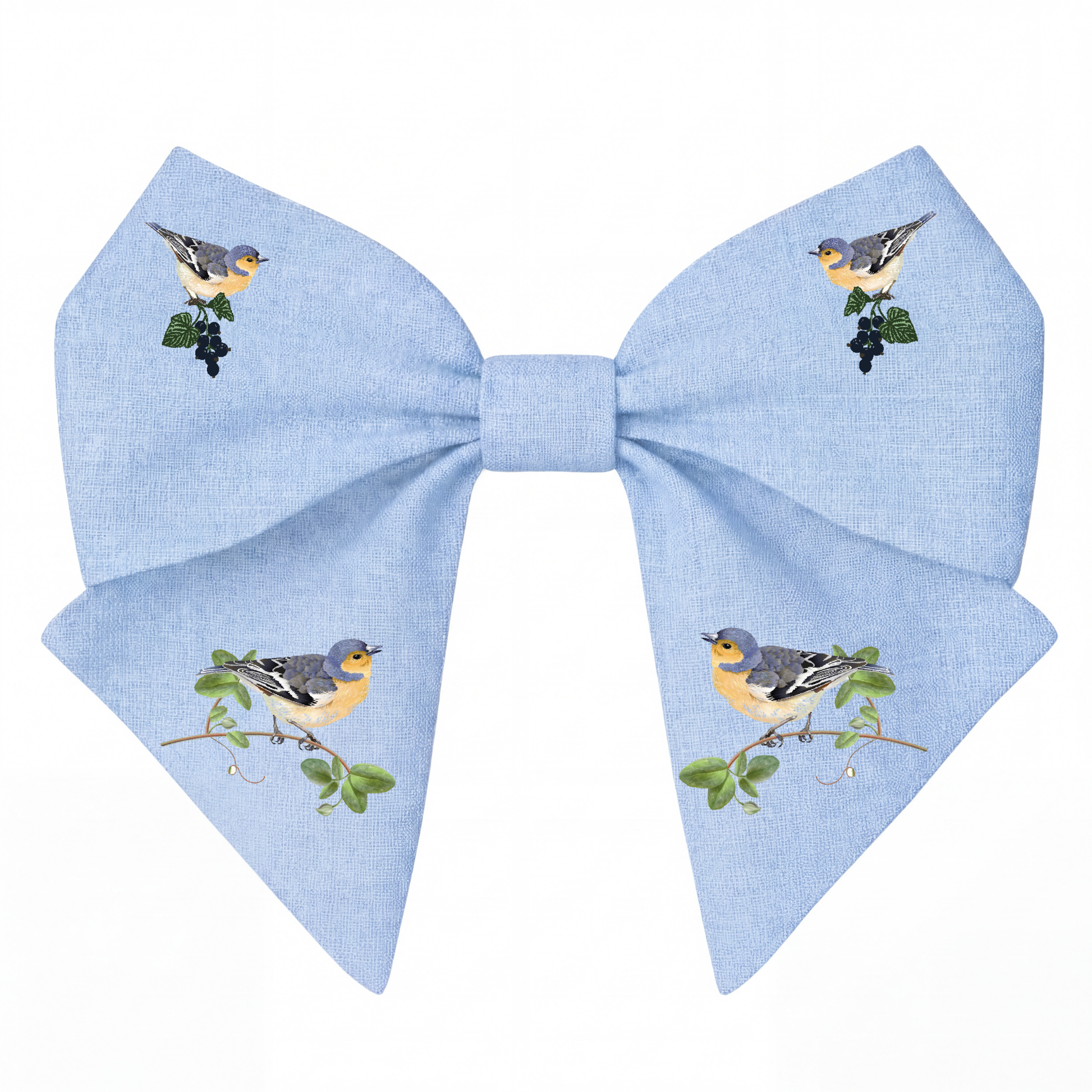Elegante fiocco per capelli in lino naturale con delicata stampa di uccellini su rami. Un accessorio raffinato che unisce semplicità e carattere, perfetto per completare look romantici e quotidiani.